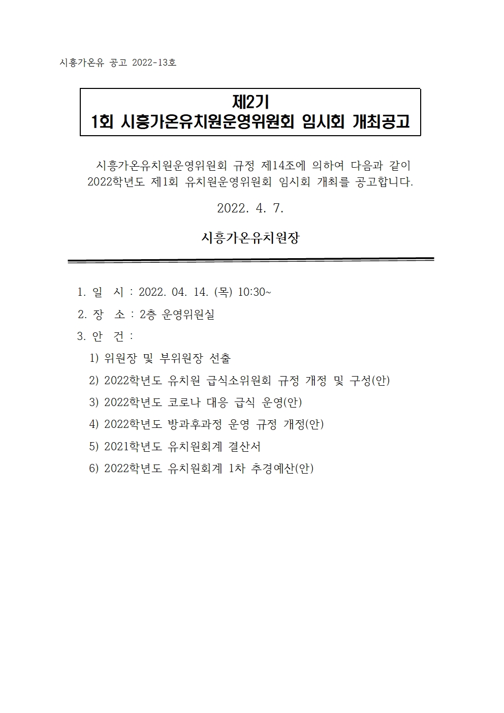 2022Çг⵵ Á¦2±â 1ȸ ½ÃÈï°¡¿ÂÀ¯Ä¡¿ø¿î¿µÀ§¿øÈ¸ ÀÓ½Ãȸ¸¦ ºÙÀÓ ÆÄÀϰú °°ÀÌ °ø°íÇÕ´Ï´Ù.
